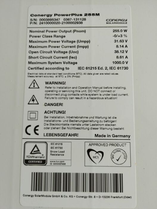 Bei den PV-Modulen handelt es sich um B-Ware. Die PV-Module werden ohne Garantie oder Gewährleistung verkauft. Sollten Restgarantien bestehen, können diese eventuell beim Hersteller (sofern dieser nicht insolvent ist) durch den Käufer geltend gemacht werden. Wir weisen ausdrücklich darauf hin, dass wir als Verkäufer keine Gewährleistungsansprüche oder Garantien geben können. Mit der Durchführung Ihres verbindlichen Kaufes erklären Sie sich damit einverstanden!