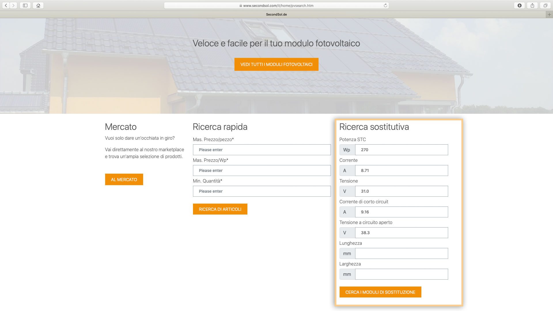 Trasferisci i dati dalla scheda tecnica o dall'etichetta nella maschera di ricerca. Per il momento, fai a meno della lunghezza e della larghezza dei moduli.
