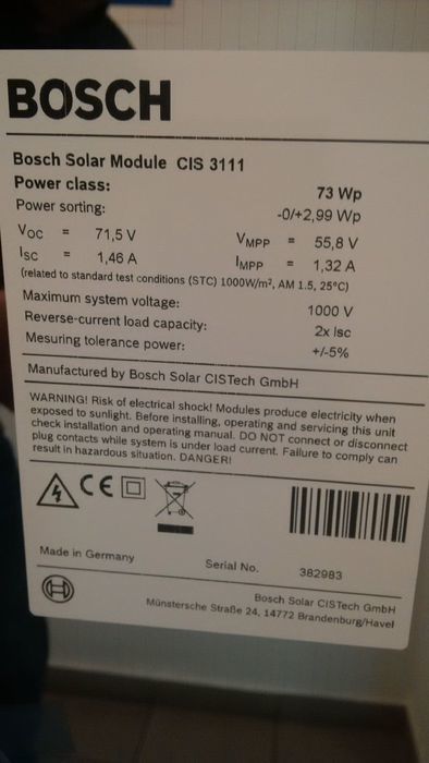 Zonnepanelen / CIS / CIGS / Bosch Solar - CIS 3111 73Wp