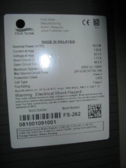 First Solar FS-262 / First Solar FS 262 / First Solar FS262 / First Solar FS - 262