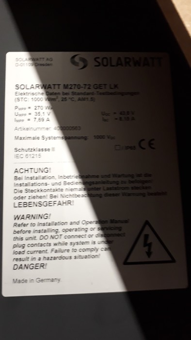 Bei den PV-Modulen handelt es sich um Restposten. Die PV-Module werden ohne Garantie oder Gewährleistung verkauft. Sollten Restgarantien bestehen, können diese eventuell beim Hersteller (sofern dieser nicht insolvent ist) durch den Käufer geltend gemacht werden. Wir weisen ausdrücklich darauf hin, dass wir als Verkäufer keine Gewährleistungsansprüche oder Garantien geben können. Mit der Durchführung Ihres verbindlichen Kaufes erklären Sie sich damit einverstanden!