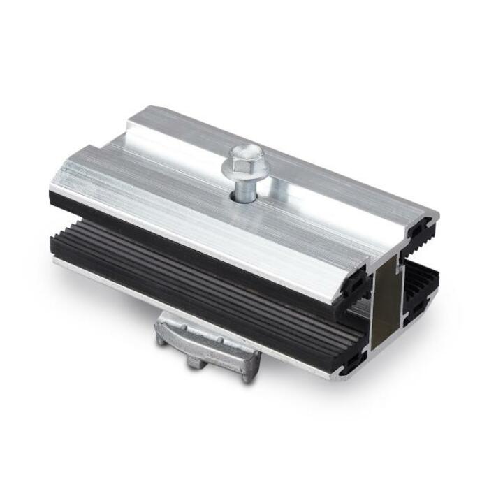Middenklem voor het bevestigen van frameloze modules op de C-rail, toegestane glasdikte 6,8 - 8,0 mm, compleet voorgemonteerd. Aandrijfklemschroef SW 8.
