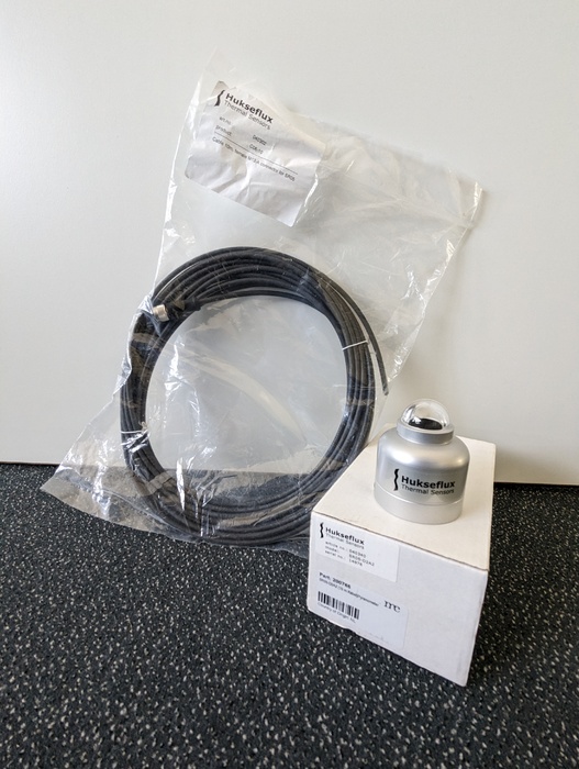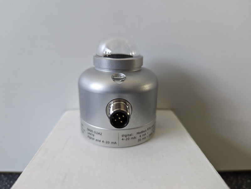 SR05 pyranometer employs a thermopile sensor with black coated surface, one dome and an anodised aluminium body with visible bubble level. SR05 has a variety of industry standard outputs, both digital and analogue: