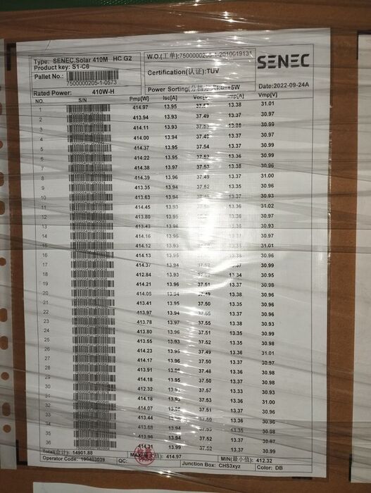 De belangrijkste informatie in één oogopslag:Fabrikant: Senec SolarModuletype: 410M HC G2 S1-C4 B2Moduletype: Monokristallijne perc halfcel module Max. Vermogen: 410 WSVoeding: 1500 VAansluiting: MC4-Evo2 (Stäubli)Montagemogelijkheden: horizontaal, verticaalCeltype: Perc - halve celMax. Module-efficiëntie: 21 %Beschermingsklasse: IP68Frame: Aluminium (zwart)Productgarantie: 12 jaarLineaire prestatiegarantie: 25 jaar