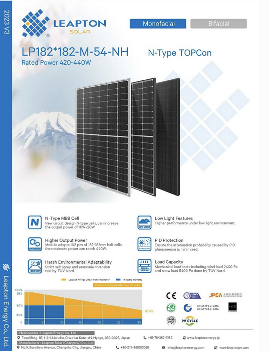 430W Leapton N-Type Full Black Black Frame LP182*182-M-54-NH. Photovoltaic mono. 15-year product warranty, 30-year performance warranty, guaranteeing 87.4% efficiency after 30 years.