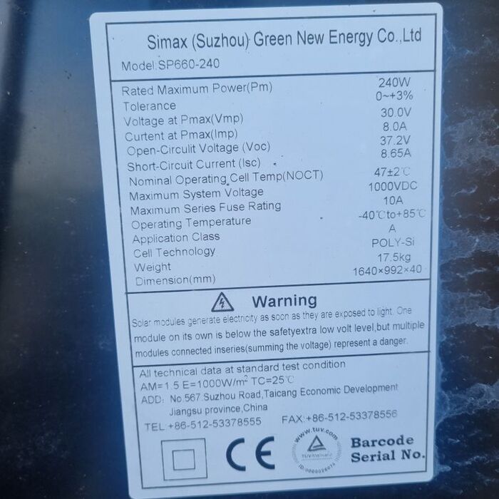 Das Modul Simax - SP660-240 ist ein Mono-Kristallines Modul mit 240 Wp.
