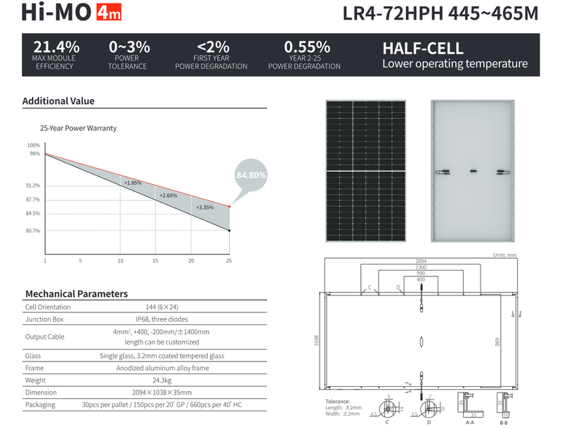 Das Longi Solar LR4 72HPH 460M Solarmodul besteht aus 72 monokristallinen Zellen, die in zwei Hälften geschnitten sind. Diese neue Half-Cut Technologie bei Solarmodulen steigert den Wirkungsgrad durch tiefere Temperaturen, und verbessert die Leistung bei Teilbeschattung der Solarfläche. Das hocheffiziente HiMO4m weist einen Wirkungsgrad von 21.4 Prozent auf, ein erstaunliches Ergebnis, das mit wesentlich teureren Modulen bekannterer Hersteller mithalten kann. Das LR4 72HPH 460M Photovoltaikmodul zeichnet sich zudem durch seine enorme Langlebigkeit aus - nach 25 Jahren wird ein Wirkungsgrad von bis zu 85 Prozent erreicht. Das Modell hat 144 Halb-Zellen, einen 35mm hohen Aluminiumrahmen und ein Gesamtgewicht von nur 23,5 kg. Die Module zeichnen sich durch eine positive Leistungstoleranz von bis zu 5 kW sowie einen effizienten Betrieb auch bei starker Bewölkung aus.