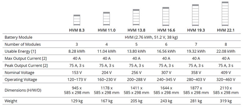 [1] Nutzbare DC Kapazität, Testbedingungen: 100% DOD, 0,2C Ladung und Entladung bei +25°C ; nutzbare Kapazität ggf. abhängig vom Wechselrichter
