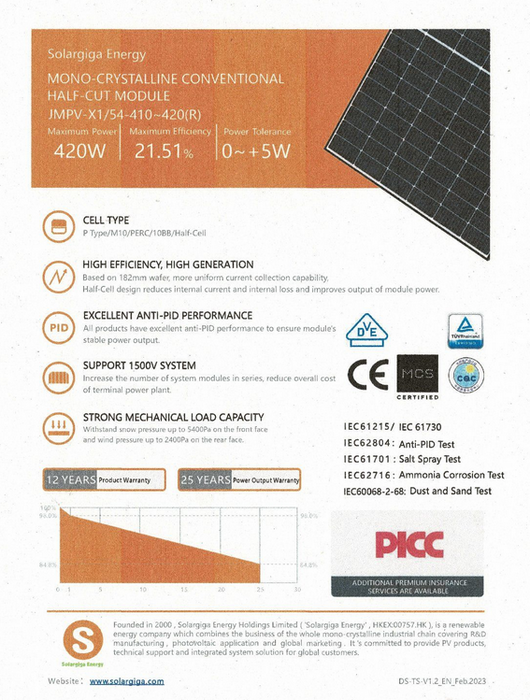 Solargiga Energy Solarmodule /JMPV-X1/54-410-420(R)
