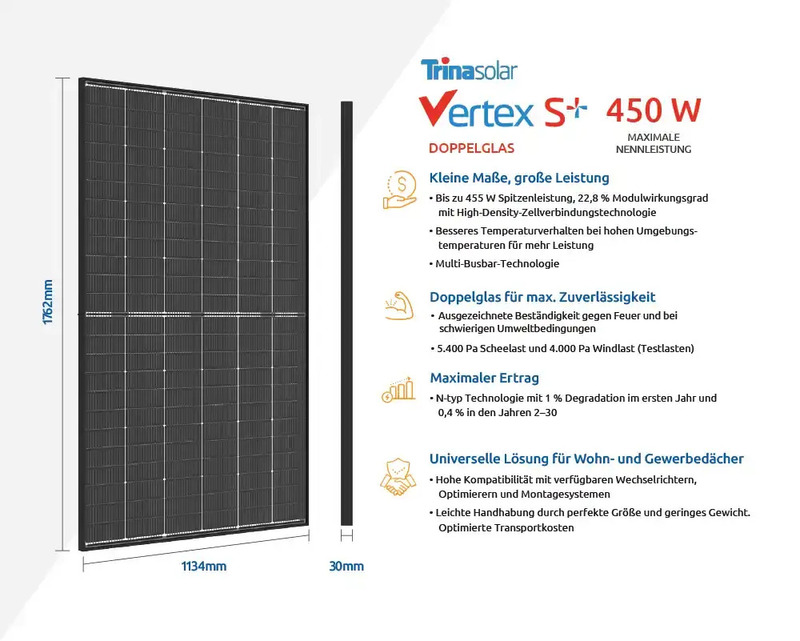 • Bis zu 455 W Spitzenleistung, 22,8 % Modulwirkungsgrad mit
