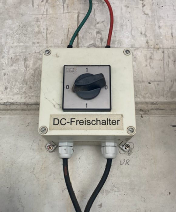 Zusätzlich gibt es einen DC-Freischalter (also für Trennung der Gleichstromversorgung zwischen PV-Modulen und Wechselrichter).