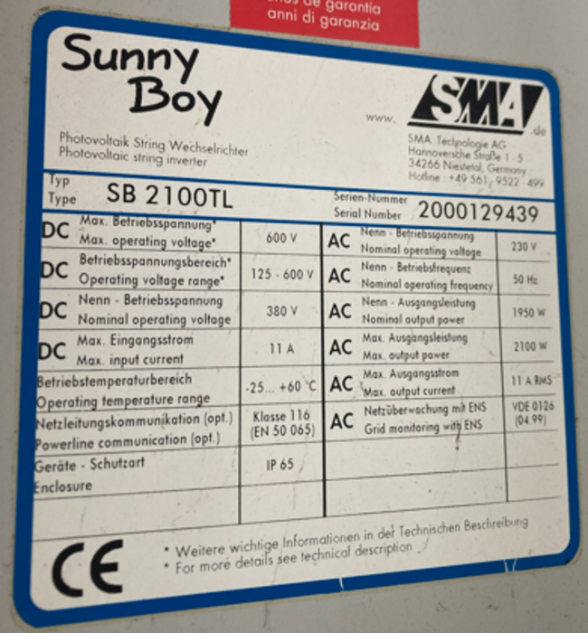 Verkaufe 1 Stck. String-Wechselrichter Sunny Boy 2100 TL von SMA.